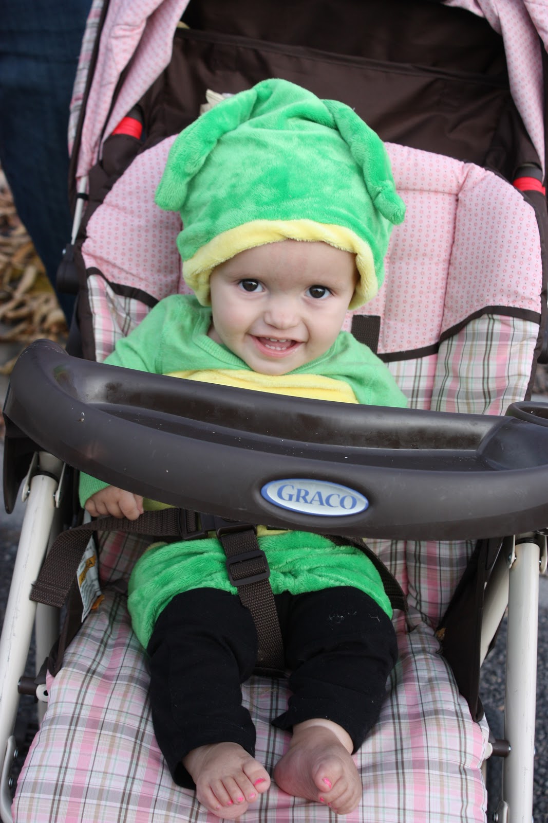 Halloween, for some reason seems to get more difficult for me every year. Maybe it's because I have more children? Who knows. The boys asked if Remi could be Izzy, from Jake and the Neverland Pirates. So I made her a pink costume (pixie dust and all) and she wore it to the church carnival, where she drooled candy all over it and smeared a banana in it. And because I certainly did NOT have time to drop all of my cookie making and class visits on Halloween to do laundry, she didn't have her costume for the actual trick-or-treating. Thankfully, I'm obsessed with keeping all of our costumes for dressup and I was able to dig up the old inch worm costume for her. It was a little snug, but it worked! :)